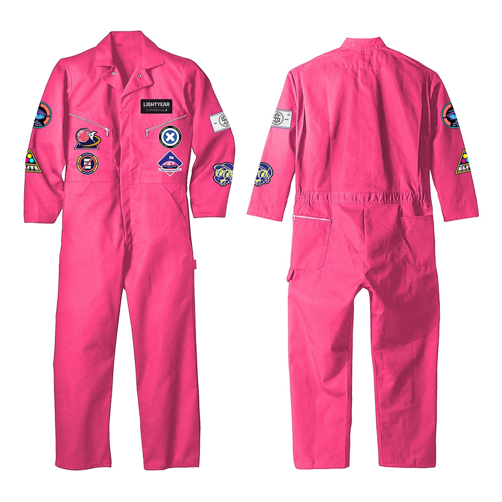 Custom-made pink jumpsuit featuring 9 embroidered patches. Constructed from a 65/35 polyester/cotton blend.